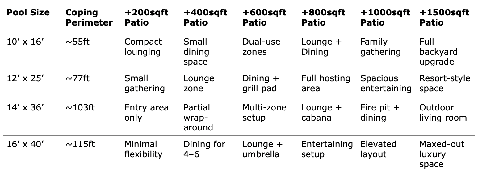 These benchmarks help our clients visualize how much functional space each square footage option provides. A 200–400 sqft patio may fit two lounge chairs and a bistro table, while a 1000–1500 sqft layout supports outdoor kitchens, fire features, or shaded structure zones.